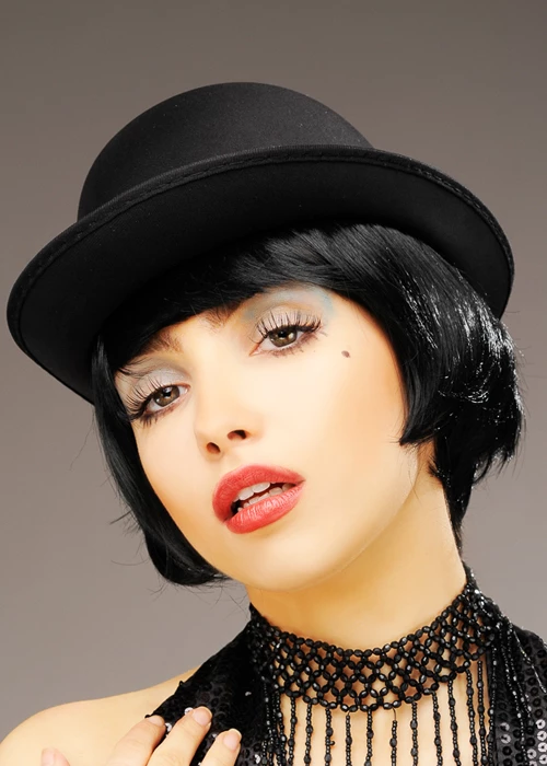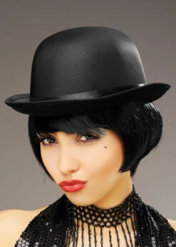 A fantastic value accessory a Liza Minelli in Cabaret inspired outfit, this black satin finish bowler hat comes in one adult size.