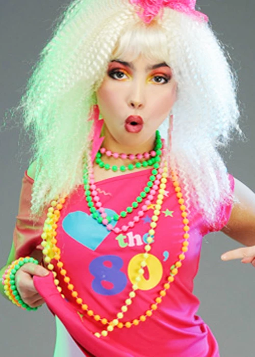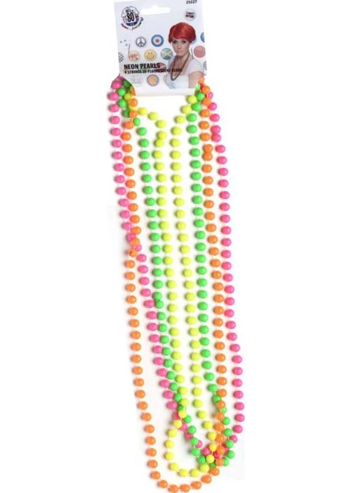 1980s pop star or raver style fancy dress jewellery pack of 4 neon coloured plastic beads, includes pink, yellow, green and orange.