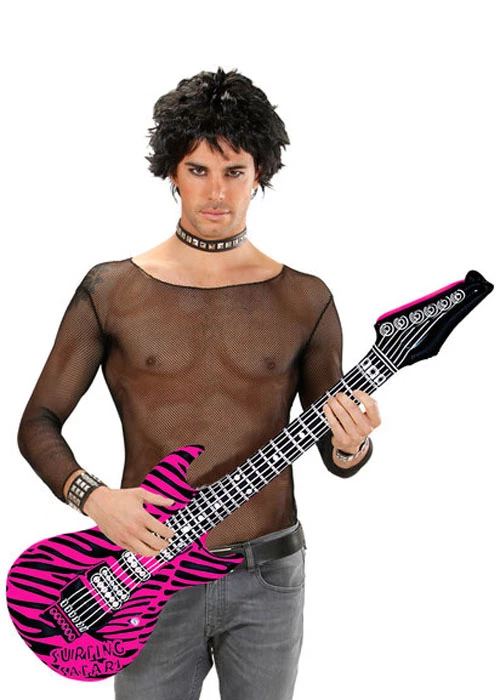 This bright pink animal print inflatable guitar makes the perfect prop for an 80s rock star costume, measures 105cm.
