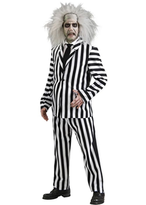 This amazing adult size Beetlejuice fancy dress costume is a great choice for Halloween! Includes a black and white striped long sleeved jacket, matching striped trousers and a mock shirt front!