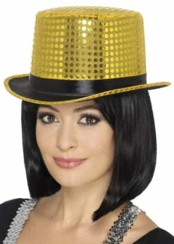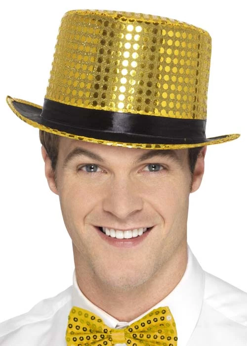 A fantastic unisex accessory for a circus or showman theme, this metallic gold sequin top hat with a black band comes in one standard adult size.
