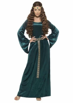 A gorgeous Maid Marion from Robin Hood inspired costume, this medival maid outfit includes a long green velvet dress with a gold waist detail and a headband with jewel.
