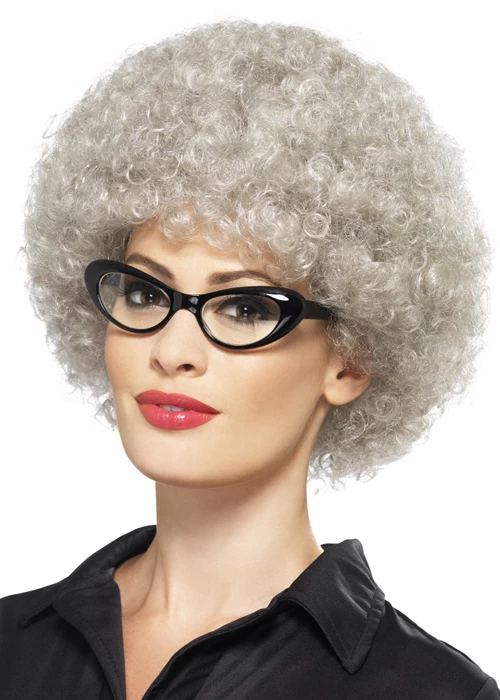 Adult size old woman or granny style fancy dress accessory short grey bushy curly perm wig, comes on an elasticated net.