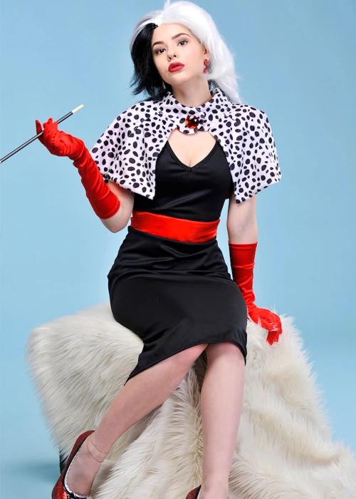 Adult womens size classic Disney movie character Cruella De Vil fancy dress costume, includes a black dress, red fabric belt, long red gloves, dalmatian print cape and a black and white cruella wig.