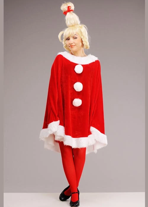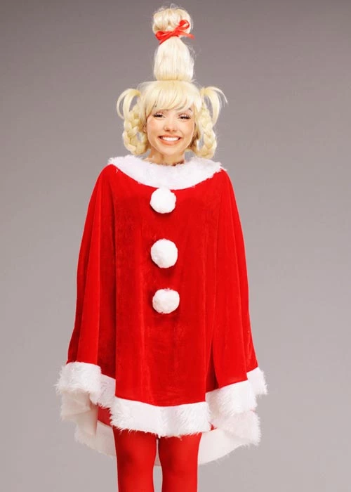 A fun festive outfit inspired by The Grinch, this Cindy Lou Who style costume includes a red Santa poncho dress with white pom poms down the front and a fake fur trim, bright red tights and a blonde wig with bow and plaited details.This costume comes in one standard size to fit a UK dress size 8-14.
