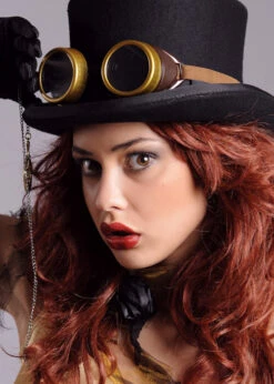 Adult size suitable for men and women victorian steam punk style fancy dress accessory steampunk dress up black and copper coloured plastic goggles on an elasticated strap.