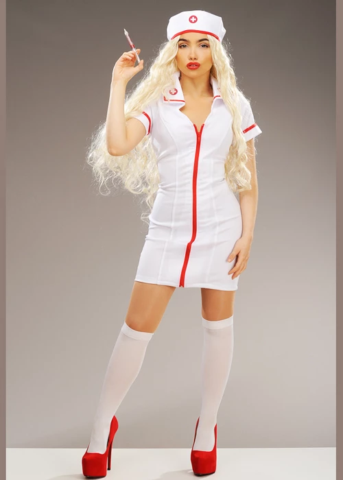 Adult size ladies cute sexy nurse uniform Fever sexy nurse fancy dress costume, includes a short white zip up the front dress and a matching fabric hat.