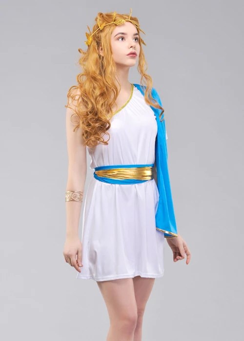 Adult size Ancient Greek or Roman lady style toga fancy dress costume, includes a white toga style robe with an attached blue cape, belt and headpiece. Please note prices may vary in store.