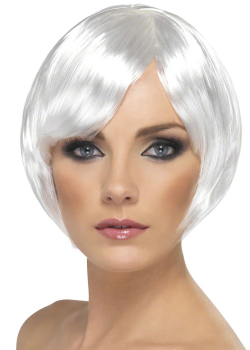 White babe style wig short bobbed with a fringe. Comes on an elasticated net to fit different sizes.