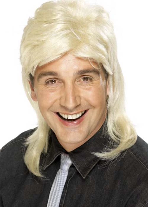 1980s rock star style mens fancy dress blonde jason style mullet wig, comes on an elasticated net to fit different sizes.