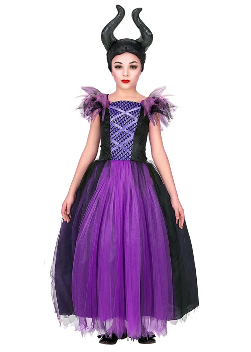 A girls gorgeous evil queen costume inspired by Maleficent, this wicked queen outfit includes a purple and black layered net dress and a fabric headpiece with horns.