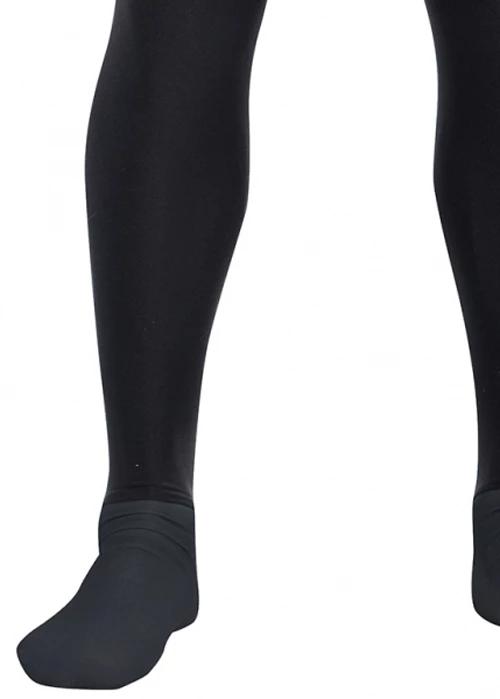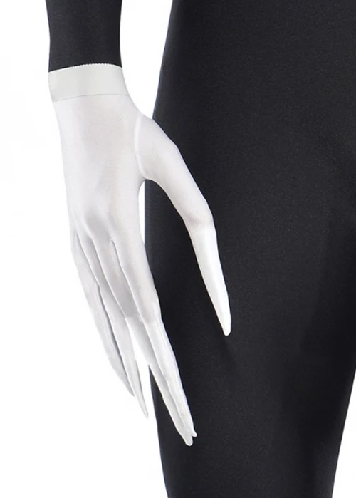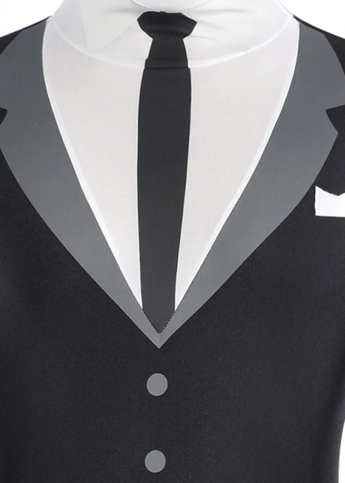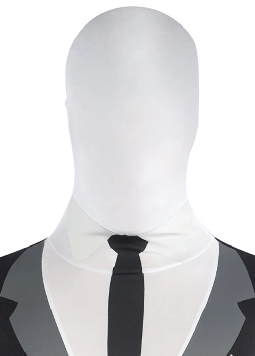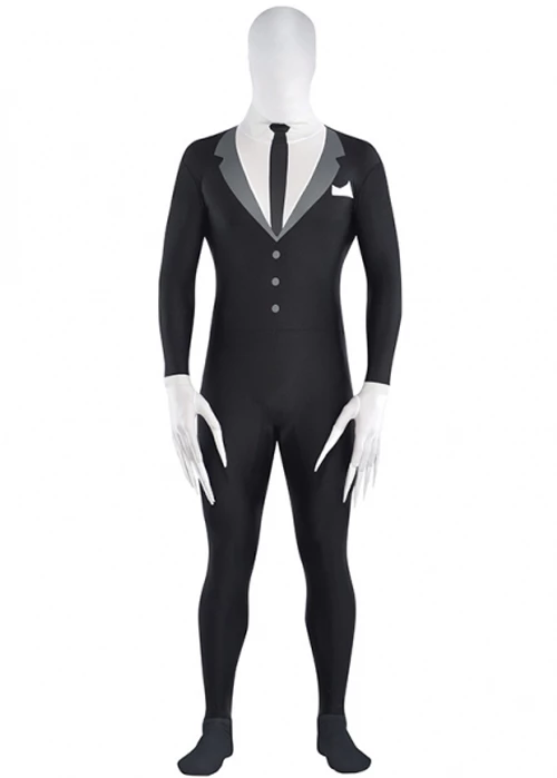 Childrens or teen size boys scary cult computer game character The Slender Man style party suit fancy dress costume, includes a 1 piece stretch spandex black and white printed suit design stretch jumpsuit with long pointed white fingers.