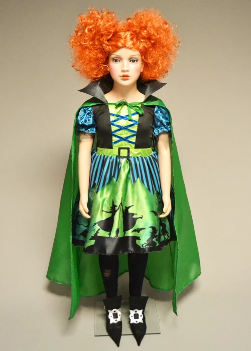 A cute fun girls outfit inspired by Winifred Sanderson from Hocus Pocus, this witch costume includes a green and black witch dress with printed design skirt, green cape and black shoe covers. Please note wig is sold seperately.