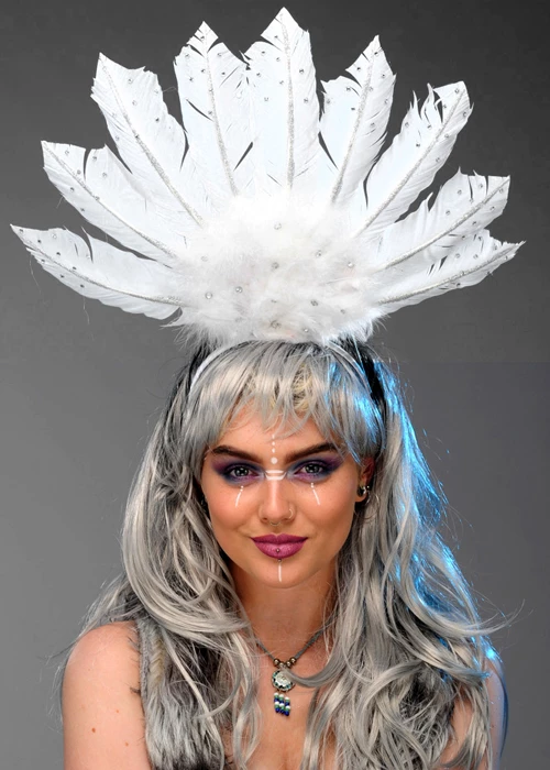 A gorgeous tribal Indian style headpiece sure to be a show stopper. This white feather headdress has diamante jewel details and comes on a headband for easy wear.