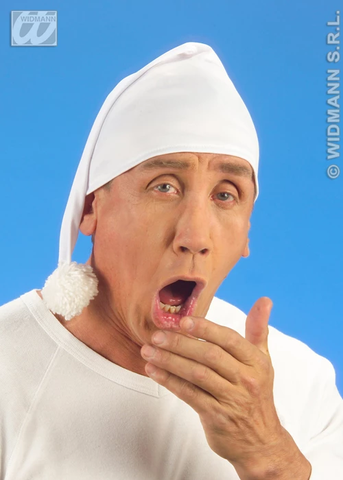 Fairytale or nursery rhyme style fancy dress white fabric sleeping night cap with a pom pom trim.