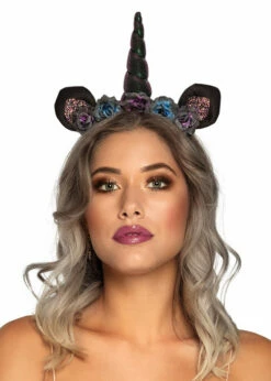 A gorgeous gothic fairytale creature fancy dress stunning black and lilac unicorn horn headpiece on flower headband with glitter details is perfect for Halloween.