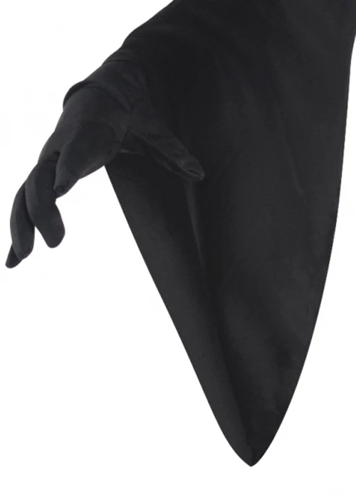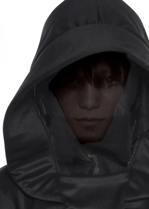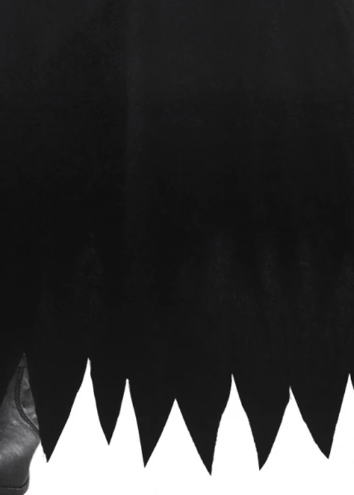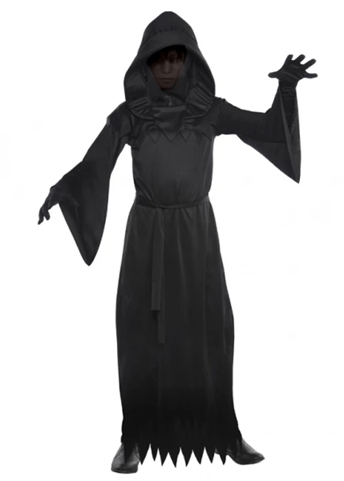 This creepy childrens size Halloween grim reaper style costume is guaranteed to scare friends and family! Includes a long black hooded robe, a black fabric face veil and tie waist belt.
