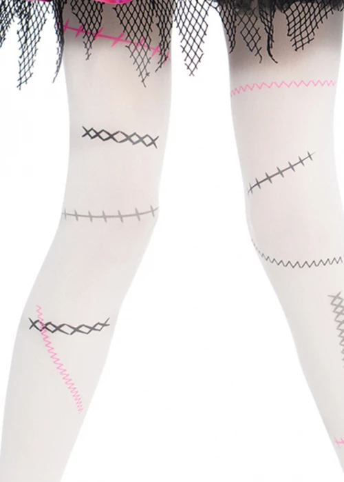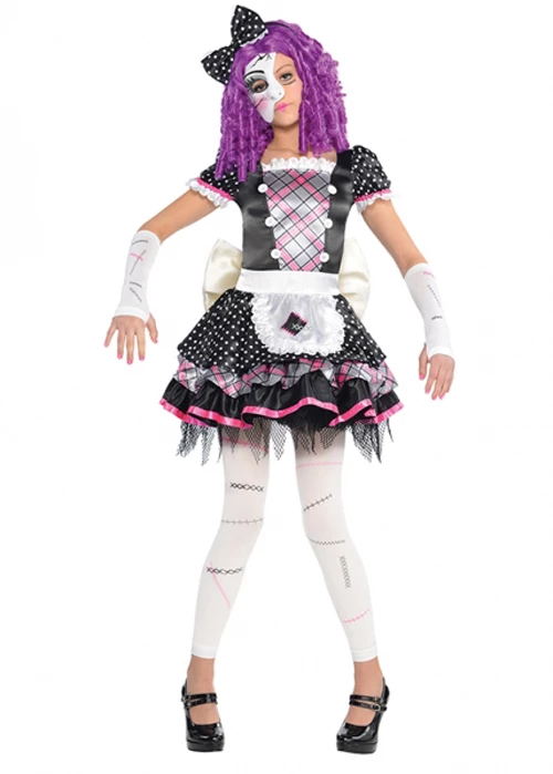 An amazing childrens size broken gothic doll Halloween costume! Includes a cute layered black and pink doll dress with attached apron, hair bow on headband, a half face doll mask, arm pieces and leggings.