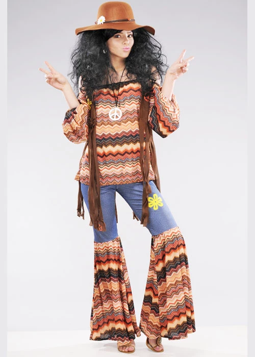 Adult ladies size 1970s flower power harmony hippy fancy dress costume, includes an off the shoulder brown zig zag striped pattern top, matching flared trousers with peace sign and a brown tasseled waistcoat.