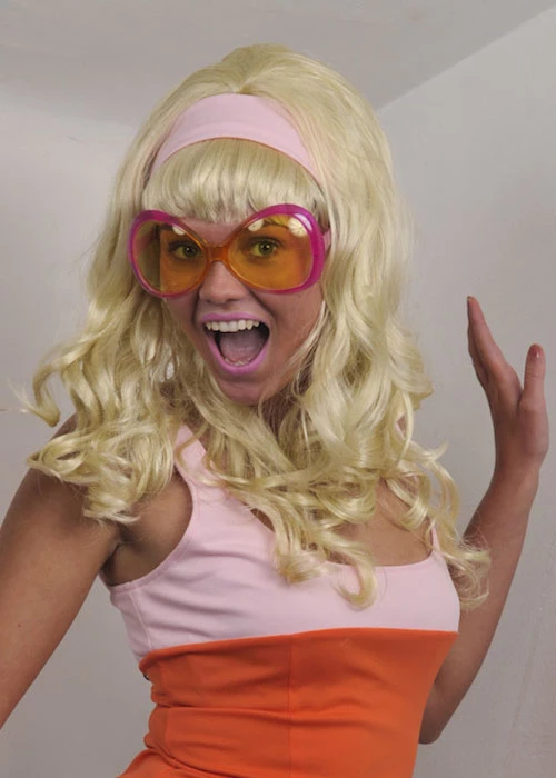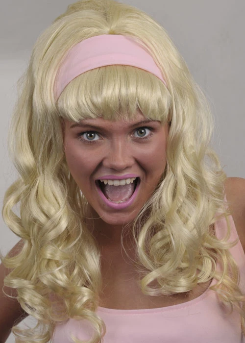Adult size ladies 1960s fashion style fancy dress gorgeous girly curly blonde beehive beauty wig with a fringe and a built up beehive at the back, comes on an elasticated net to fit different sizes.