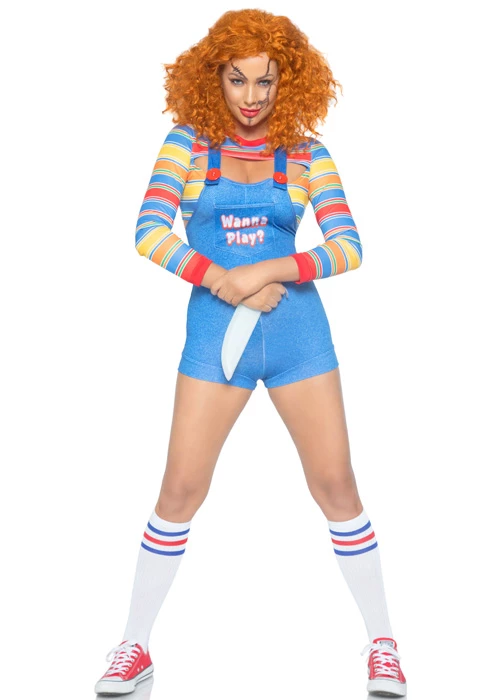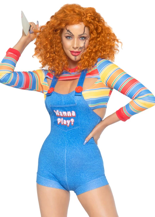 A gorgeous little outfit by Leg Avenue that is perfect Halloween Chucky style costume, this demon doll costume includes a multicoloured striped crop top with cutout neckline and blue shorts overall romper with a wanna play? design.