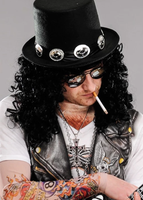 Adult mens 1980s rock star Slash style big bushy back permed style long curly rock star wig. Comes on an elasticated net to fit different sizes.