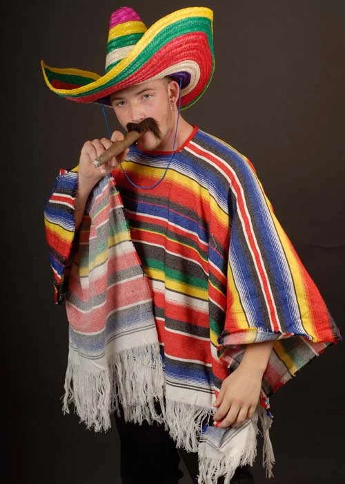 Adult size mens funny wild west mexican bandit fancy dress costume, includes a multi coloured striped Mexican style poncho. One size, loose fitting with tie on the neckline.