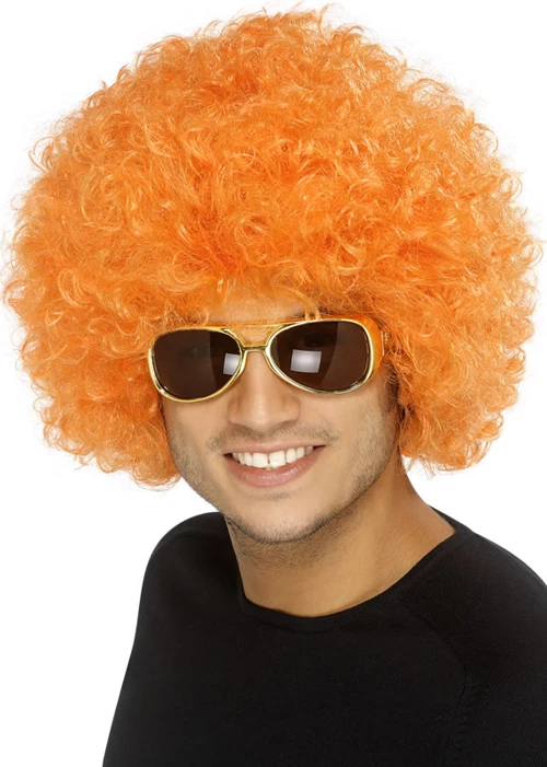 Short bright orange curly bushy style pop wig, on an elasticated net to fit different sizes.