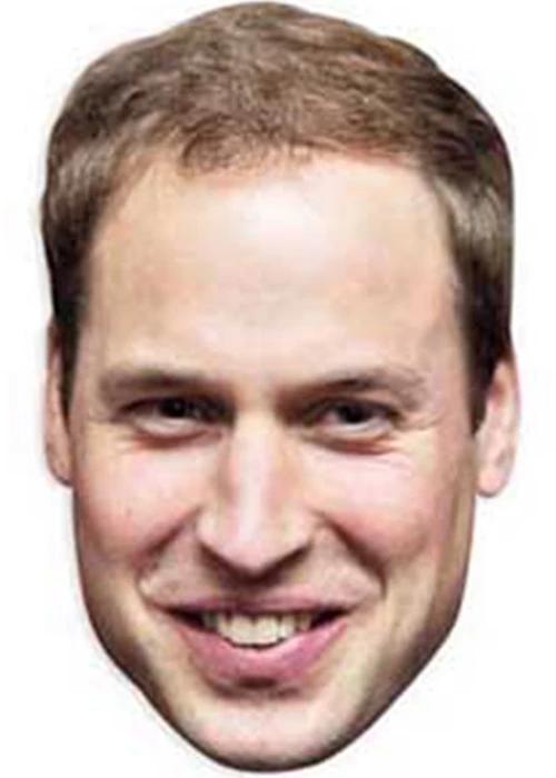 The royal family fancy dress Prince William the Prince of Wales and the Duke of Cambridge printed card face mask comes on elastic for easy wear.