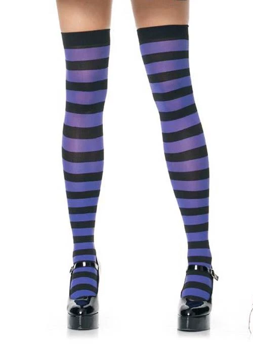 Bright purple and back striped thigh high hold up stockings, will fit a UK size 8-14.