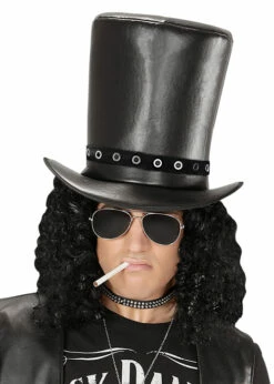 A fantastic accessory for a Slash from Guns n Roses inspired rockstar outfit, this black leather look fabric top hat feature a decorative band detail and comes in one standard adult size.