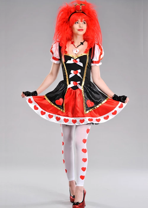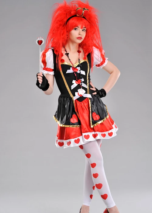 Teen girls size Alice In Wonderland style cute queen of hearts fancy dress costume, includes a black and red heart pattern dress with gold trim, black fingerless gloves, white footless tights with heart pattern and red fabric crown headpiece.