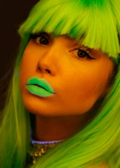 Adult womens cute fun bright neon raver style fancy dress accessory make-up intense neon green lipstick.
