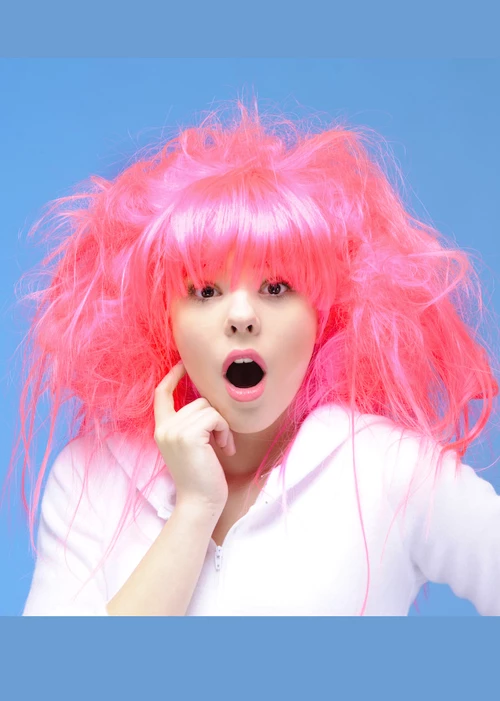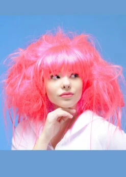 Adult ladies size cute fairy tale princess style fancy dress bright neon pink backcombed style wig with a fringe, comes on an elasticated net to fit different sizes.