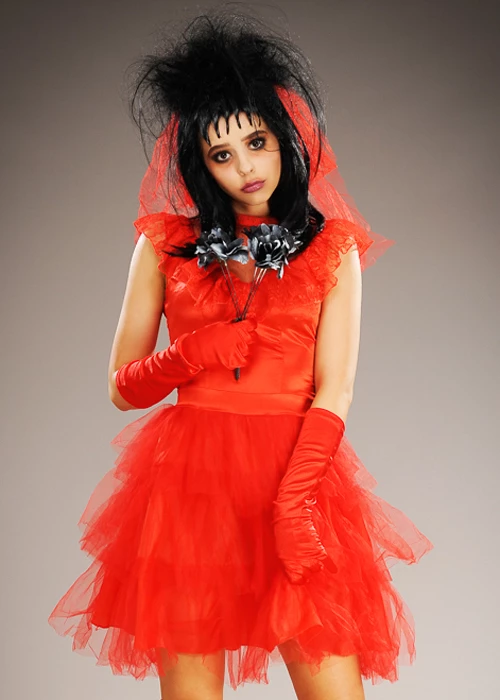 This gorgeous Lydia Red Dead Bride costume is perfect for a Beetlejuice fan and includes a short bright red lace bride dress with a feature bow on the back and a red lace veil.