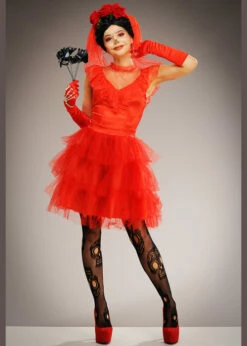 This Day of The Dead costume is perfect for Halloween and includes a short bright red lace bride dress with a feature bow on the back and a red rose headband with attached veil.