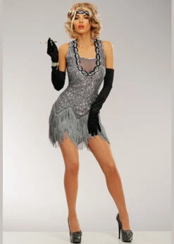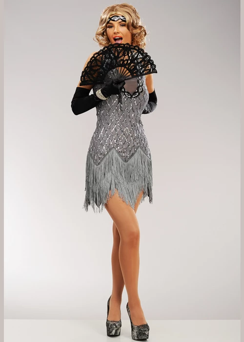 A show stopping gorgeous 1920s showgirl outfit that is perfect for a prohibition theme, this flapper girl costume includes a grey fringed dress with sequin details and mesh bustline and a matching sequin headband.