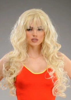 A fantastic quality Pamela Anderson in Baywatch inspired accessory. This professional synthetic hair wig, features platinum blonde curly long length (26 inches) hair with a fringe, a faux skin parting and an adjustable wig cap net. Can be styled and is heat resistant up to 120 degrees centigrade can also be hand washed.