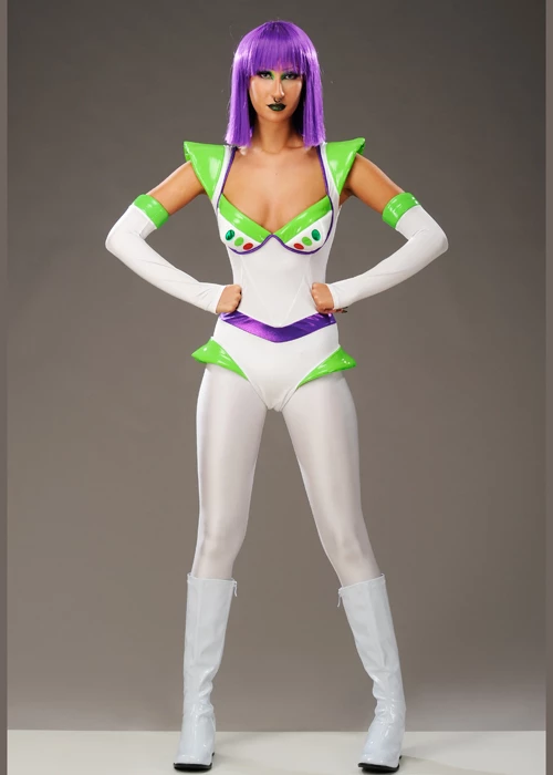 A fantastic fun adult size Buzz Lightyear from Toy Story inspired costume, this galaxy space girl outfit includes a short white lycra stretch bodysuit with purple and green sci fi trim, matching white lycra leggings and elbow length gloves.