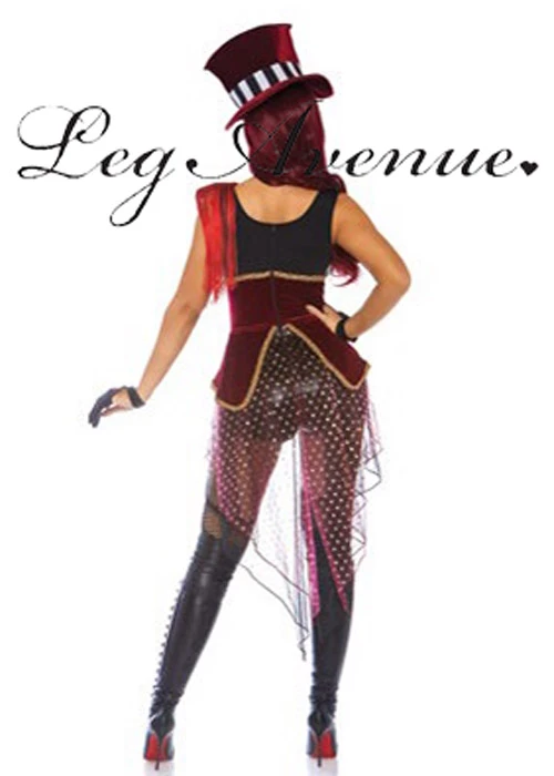 A gorgeous good quality outfit for a circus theme, this ringmaster or lion tamer costume includes a black and white short romper with a rich red waist cincher, matching deep red bow tie and fabric top hat with striped band.
