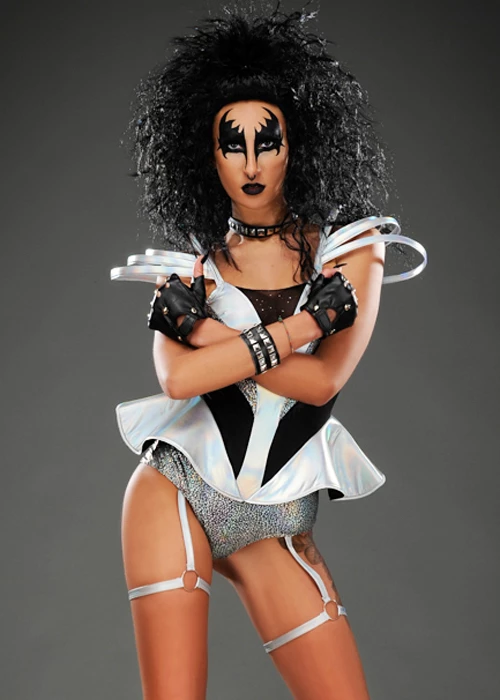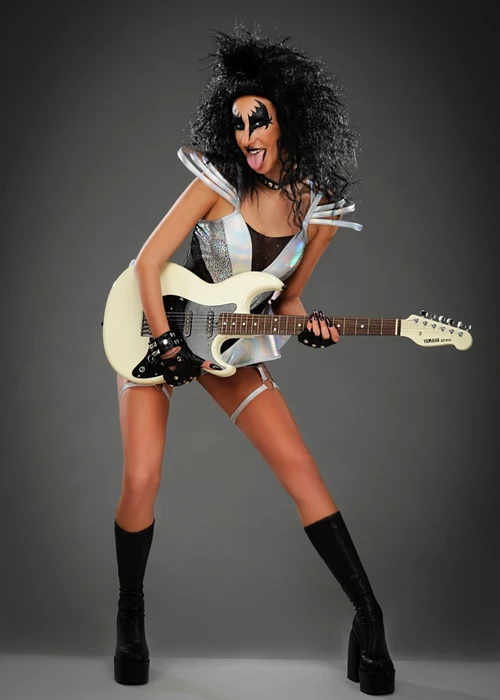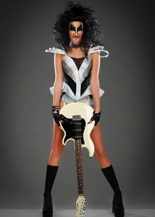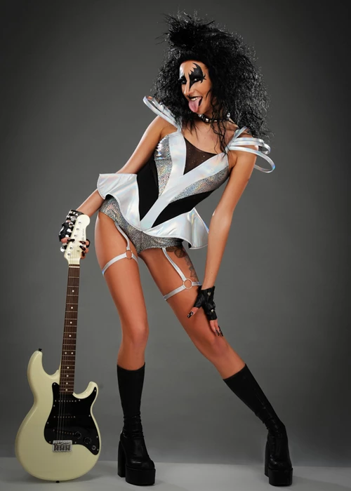 A fantastic Kiss inspired glam rock star costume that includes a silver and black short length romper bodysuit with peplums and shoulder details.