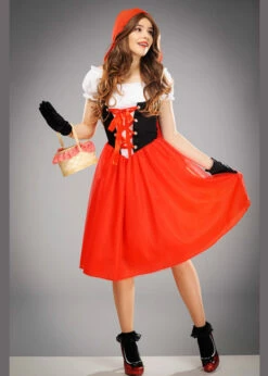 A stunning gothic Halloween outfit by Leg Avenue this Victorian Vampire costume includes a red and black lace dress with bell-sleeves and waist cincher buckle accents, scalloped stay up collar and jewel headpiece.