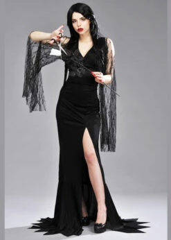 A beautiful Halloween themed fancy dress costume! Includes a long length side split black dress with black lace draping sleeves!
