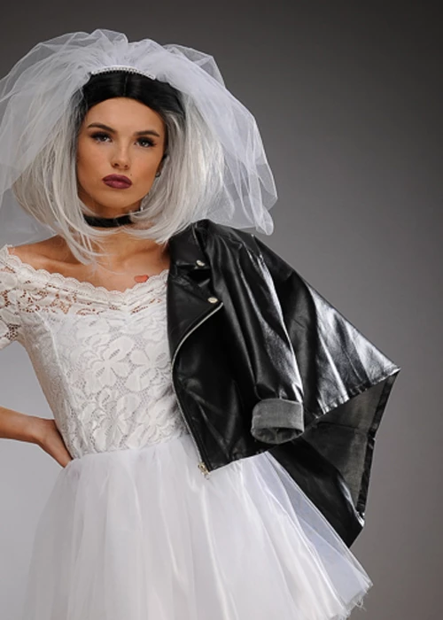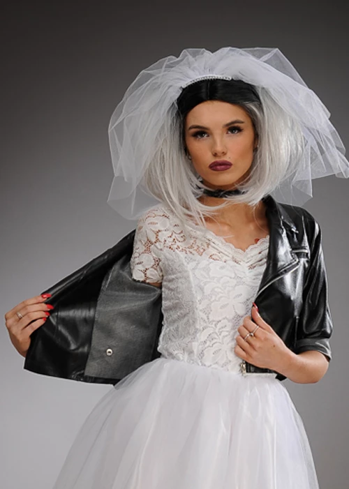 Adult womens petite size horror movie icon Bride of Chucky Tiffany inspired fancy dress black leather look fabric cropped jacket with zip fastening, comes in one petite size to fit a UK dress size 6-8.