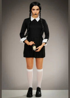 A ladies petite size Wednesday Addams inspired costume features a long sleeved black fabric dress with white collar and cuffs. Comes in one petite size to fit a UK dress size 4-6.