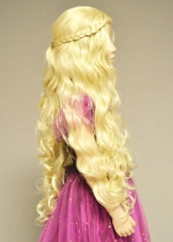 A great quality wig inspired by Princess Peach, this long blonde curly wig is made of professional synthetic hair that can be heat styled a features a cute pointed fringe. Please note does not include the tiara.