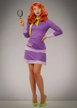A lovely adult size official Scooby Doo costume, this womens Daphne outfit includes a purple dress with printed Scooby Doo logo, lilac headband, auburn wig with fringe and a green neck tie.
