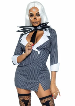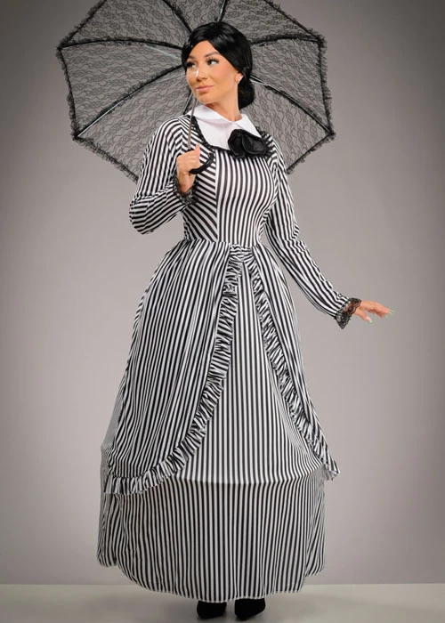 A fantastic womens period outfit, this victorian lady costume includes a long length black and white striped dress with a white collar detail.